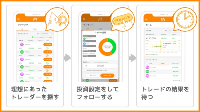 好きなトレーダーをフォローして、投資金額を決めるだけ。後は待っていれば、マネコが24時間自動で注文を行います。最低金額は1万円から。誰でも気軽にFX(CFD)投資を行うことができます。