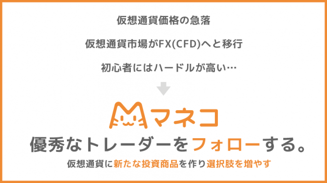 仮想通貨投資の選択肢を増やすべく優秀なトレーダーをフォローするだけで自分も同じ注文を入れる事の出来るマネコをリリースし、仮想通貨投資の選択肢を増やすべく活動しております。